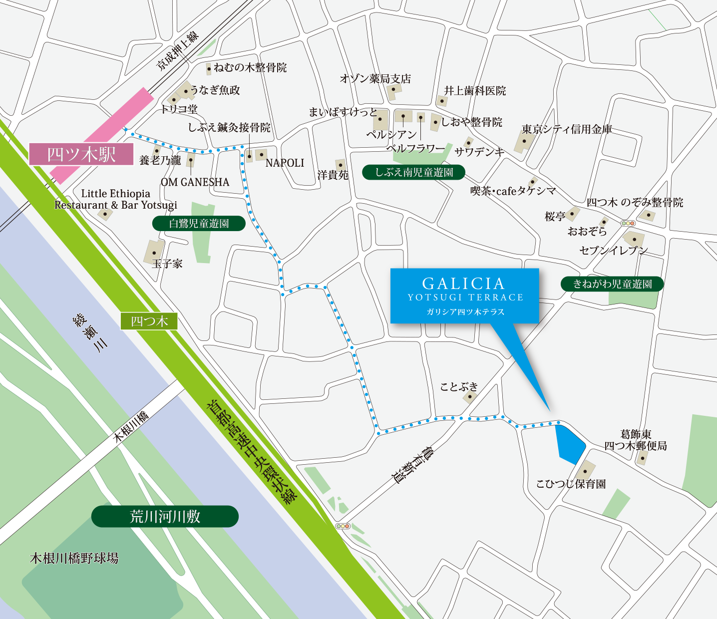葛飾東四つ木郵便局(約 80m 1分)東京シティ信用金庫 東四つ木支店(約 350m 5分)小松川信用金庫東四つ木支店(約 400m 5分)みずほ銀行 葛飾支店(約 1000m 13分)